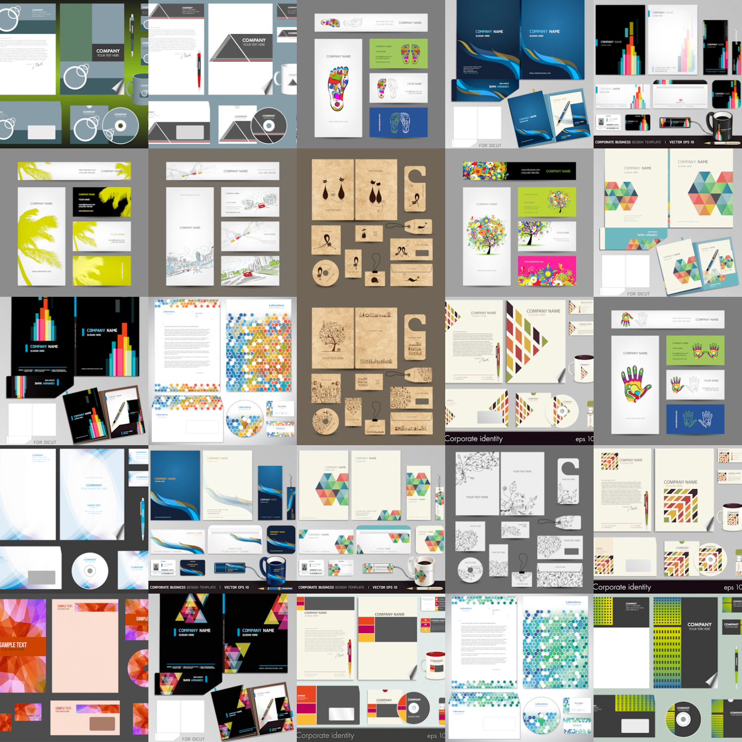 This vector image presents a complete corporate business design template set, including folders, banners, business cards, envelopes, and USB flash drives. The layout is clean and professional, using a consistent branding style with modern typography and a sleek color scheme. Ideal for corporate identity projects, this set is perfect for businesses looking to create a unified and polished brand presentation across all printed and digital materials.