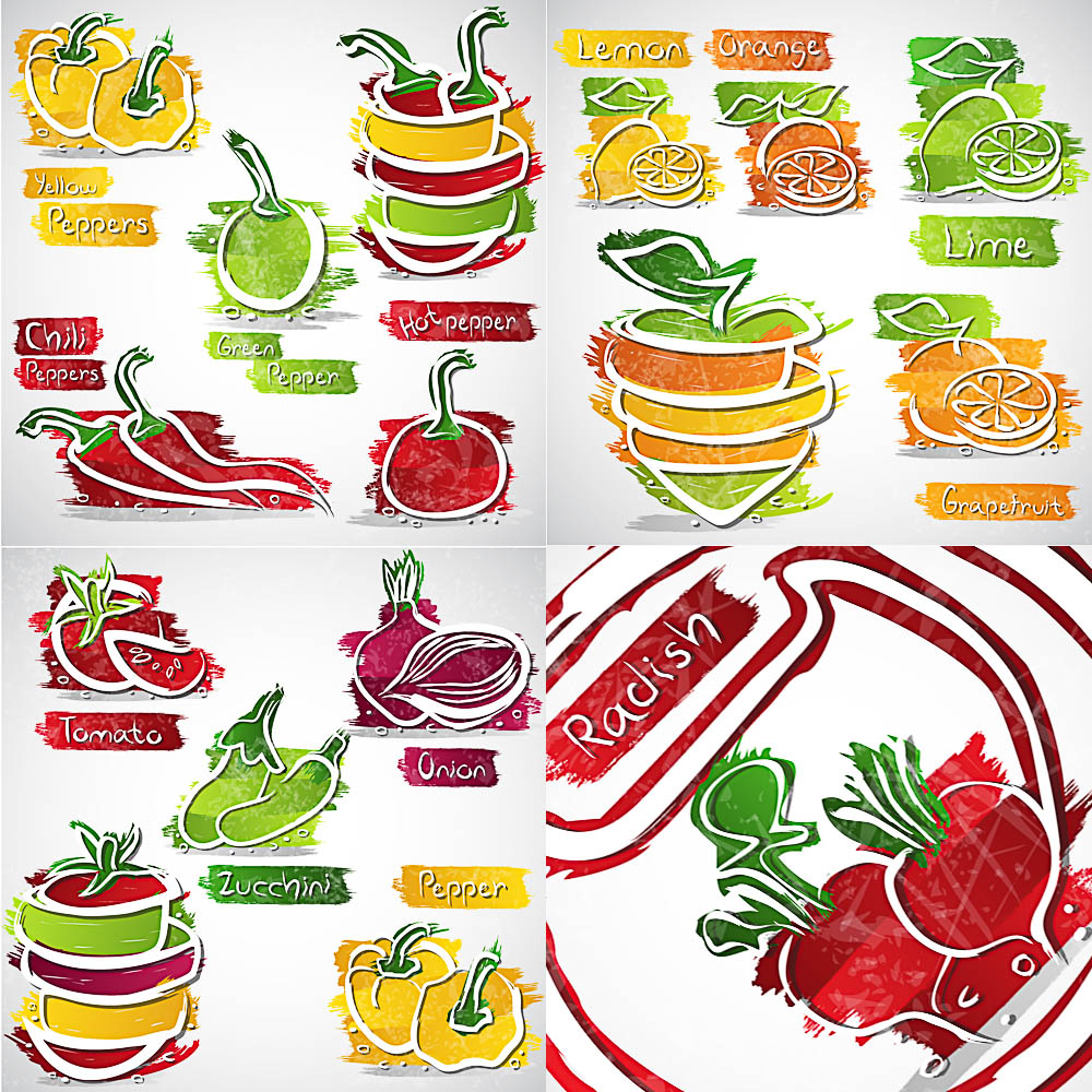 This vibrant vector illustration features creative compositions of fruits and vegetables. The design showcases colourful and stylised depictions of apples, bananas, grapes, carrots, tomatoes, and more — arranged in fun and imaginative ways. Ideal for use in healthy lifestyle promotions, organic food packaging, nutrition campaigns, or educational materials for children, this set brings a fresh and playful touch to any visual project.