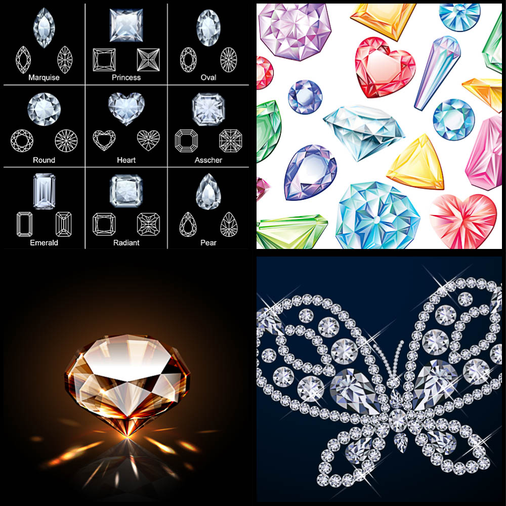 A vector illustration featuring diamonds of various shapes and cuts, including round, princess, emerald, oval, marquise, pear, and heart-shaped gems. The diamonds are depicted in high detail with reflective facets and brilliant sparkle, set against a clean, minimal background. Ideal for jewelry design, luxury branding, gemstone catalogs, or fashion-related projects, this elegant vector highlights the beauty and variety of precious stones.